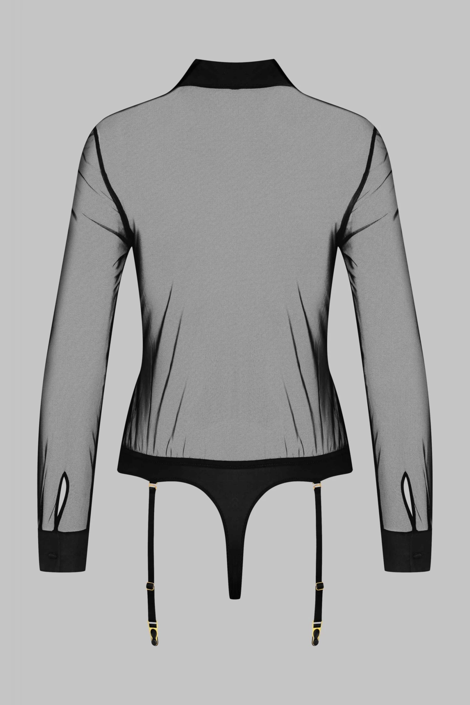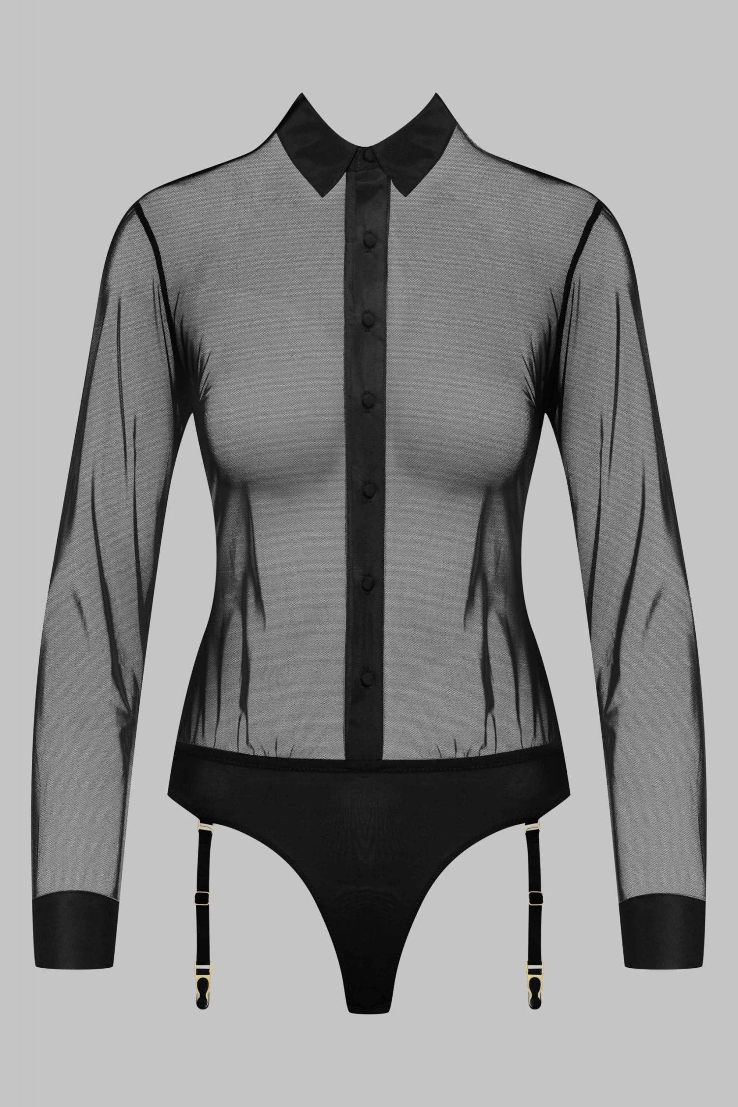 Mesh and microfiber bodysuit. Sheer shirt with mesh-covered front buttons. Microfiber thong. Cuffs and collar in double-thickness mesh.