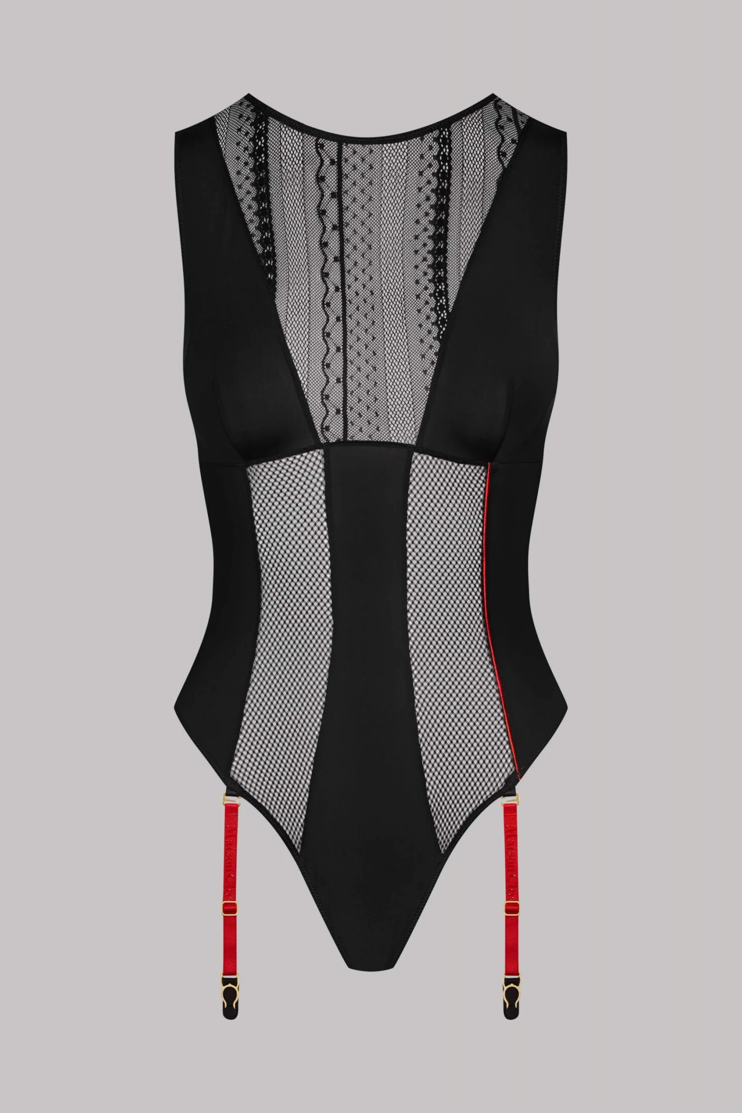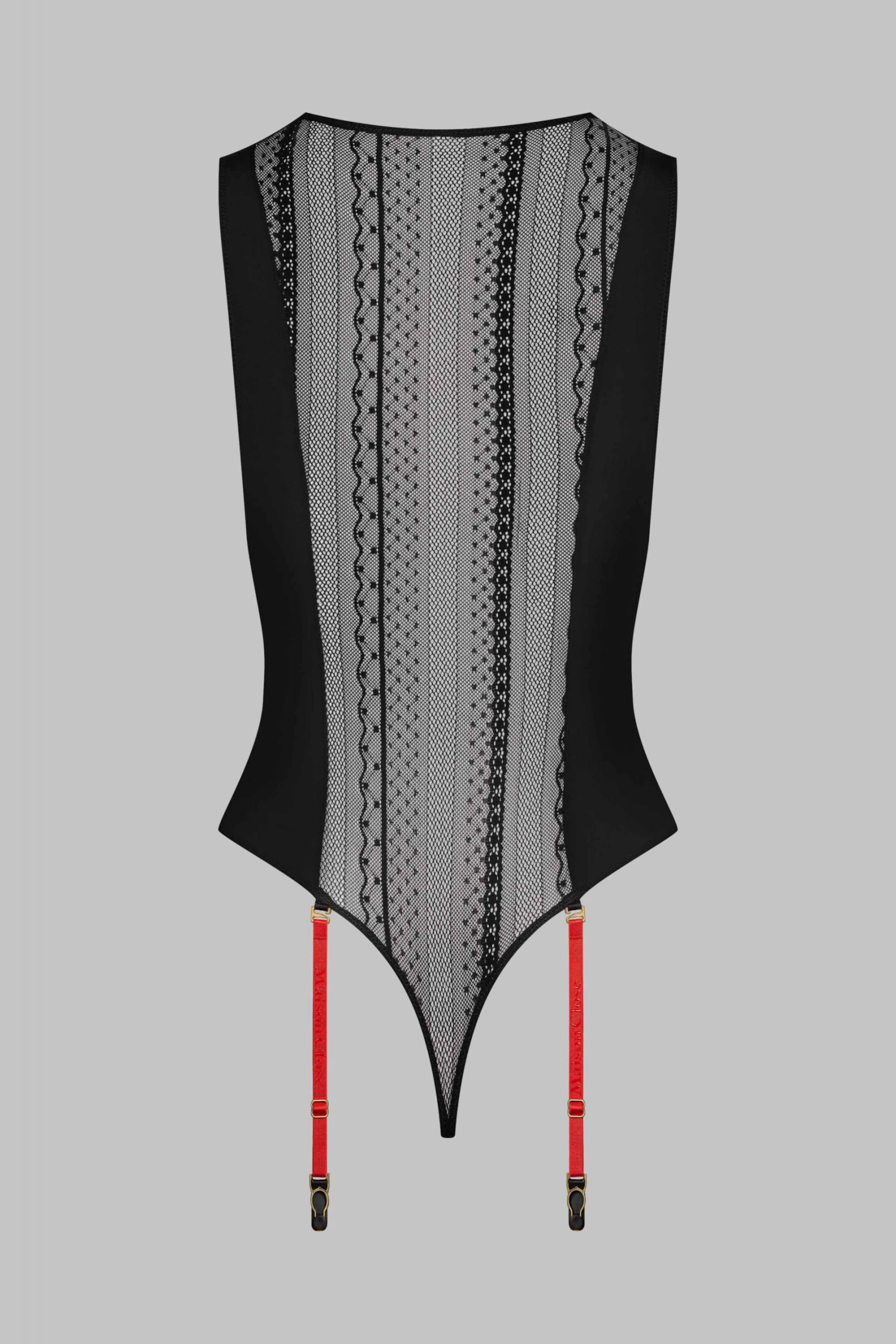 The Sacré Cœur thong bodysuit with suspenders is a graphic piece of lingerie featuring a suggestive aesthetic magnified by a lace, fishnet and microfiber trio.