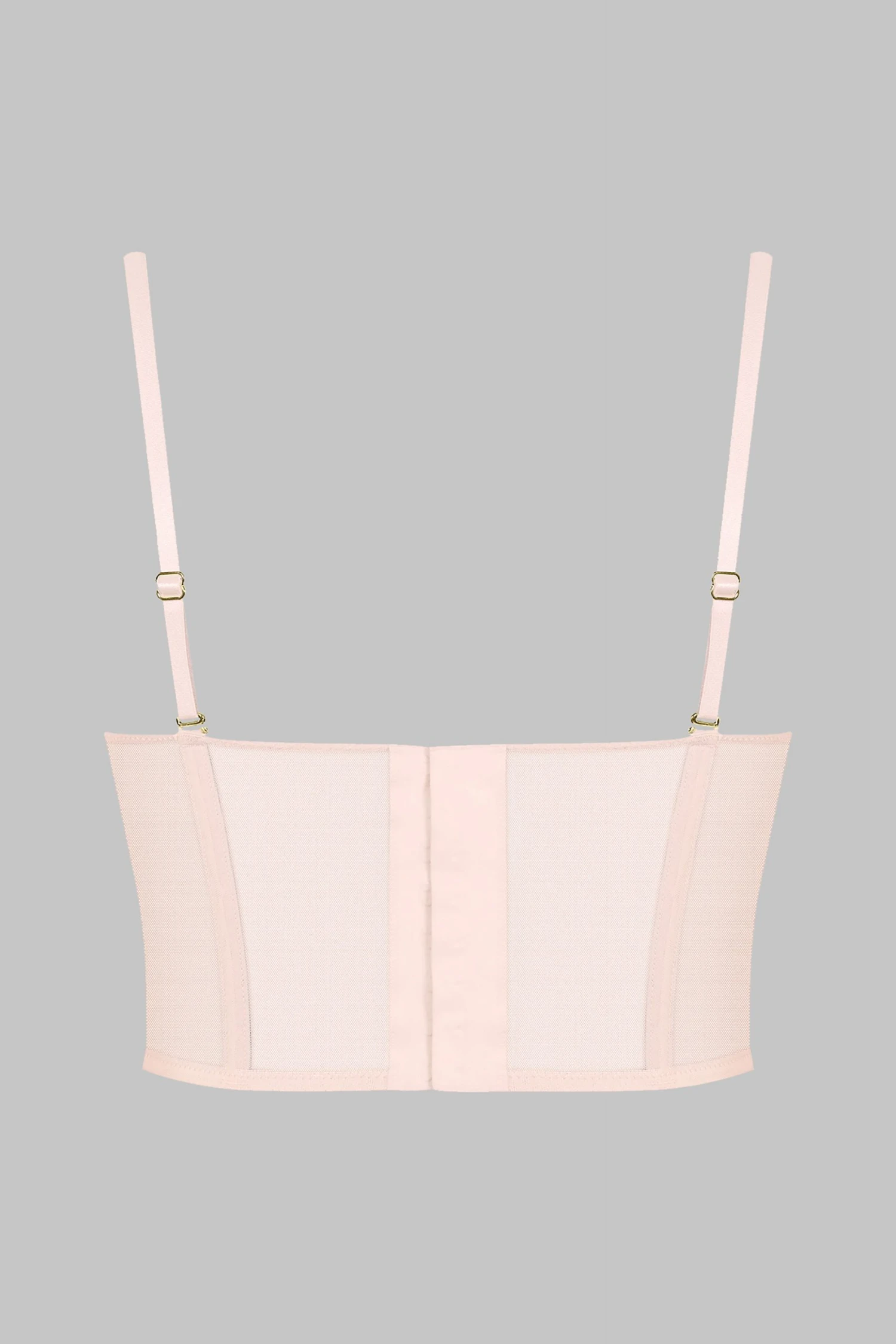 Lined mesh on the front and sides for a contrast of transparency and opacity. Bustier shape with flexible vertical boning in the front and back. Sleek and subtle hook and loop back closure.