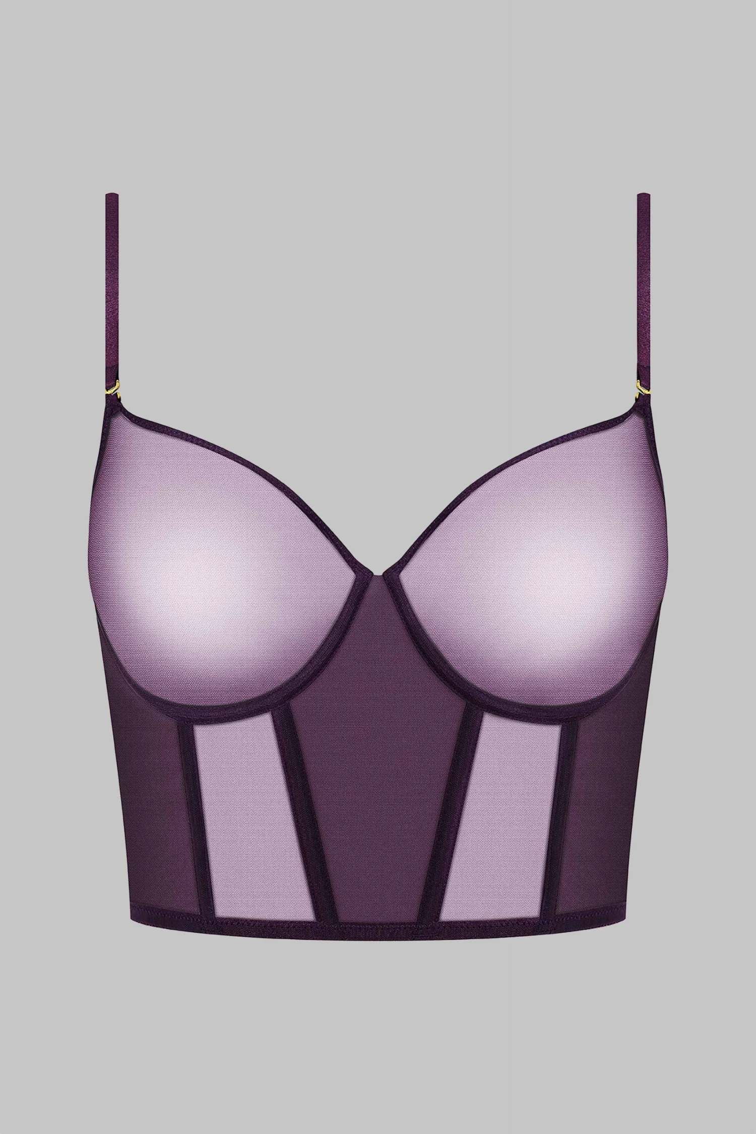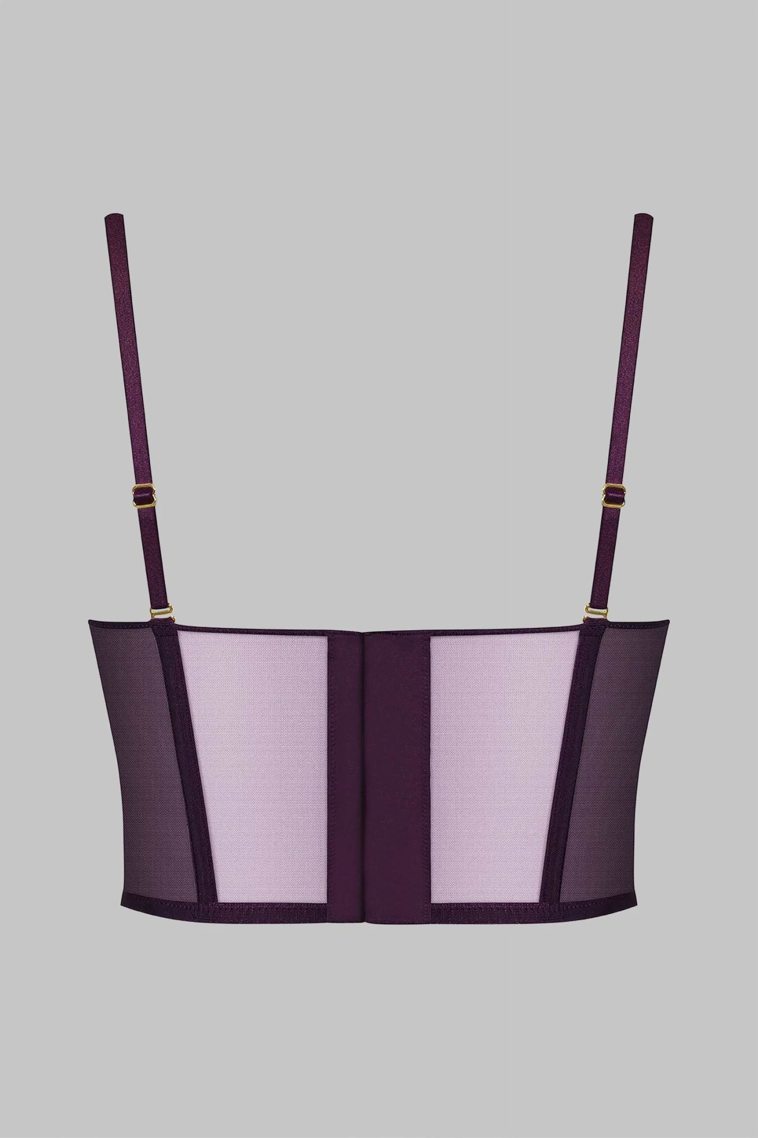 Lined mesh on the front and sides for a contrast of transparency and opacity. Bustier shape with flexible vertical boning in the front and back. Sleek and subtle hook and loop back closure.
