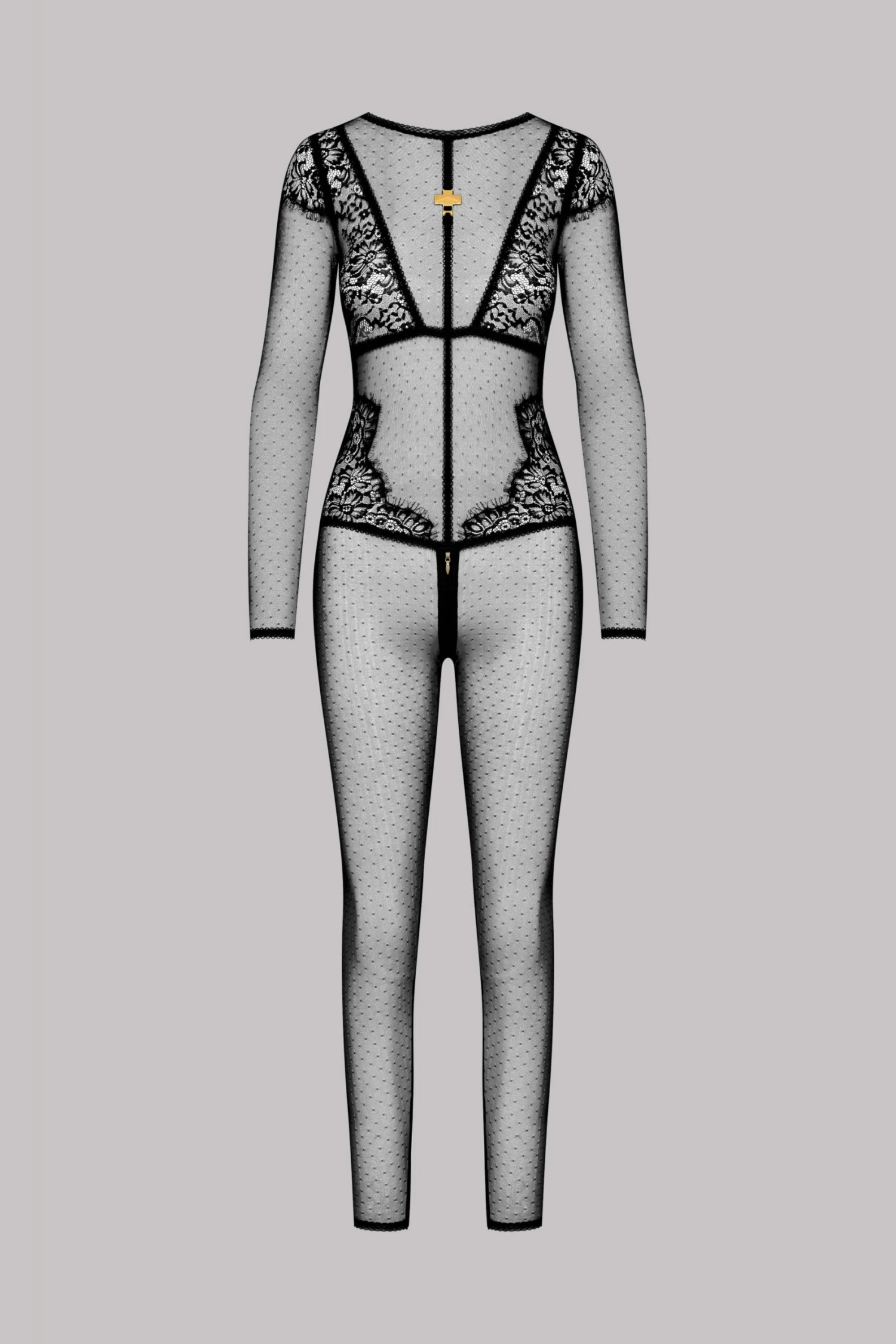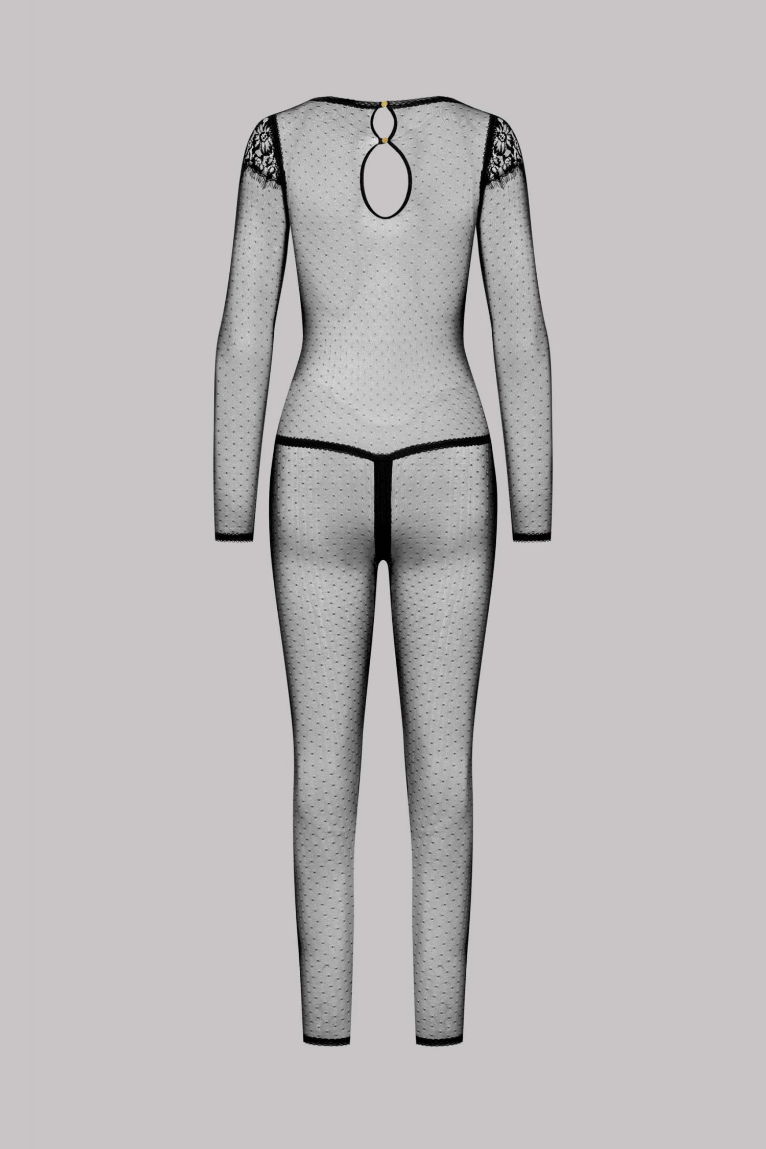 The catsuit envelops the body in a transparent mesh that sensually follows the curves.