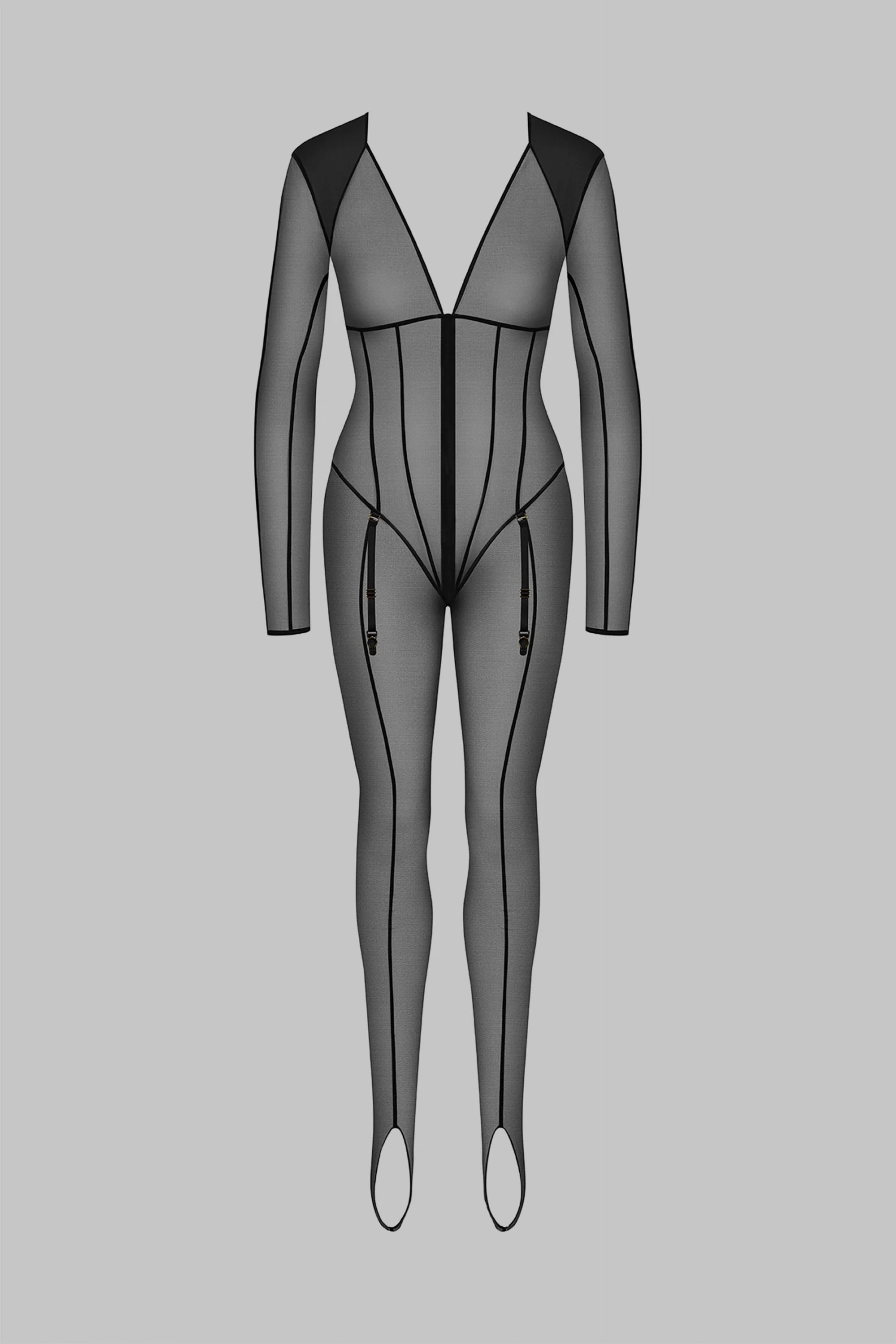 Catsuit in 100% sheer mesh. Multiple seams that structure the entire silhouette. Double seam stocking effect with stirrups. Removable outer garters for layering stockings and playing with transparency. Full zipped bodice that can be opened from either direction. Lined mesh at the shoulders.