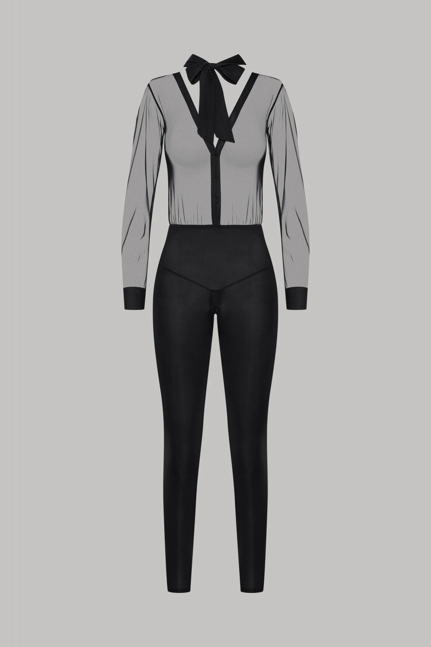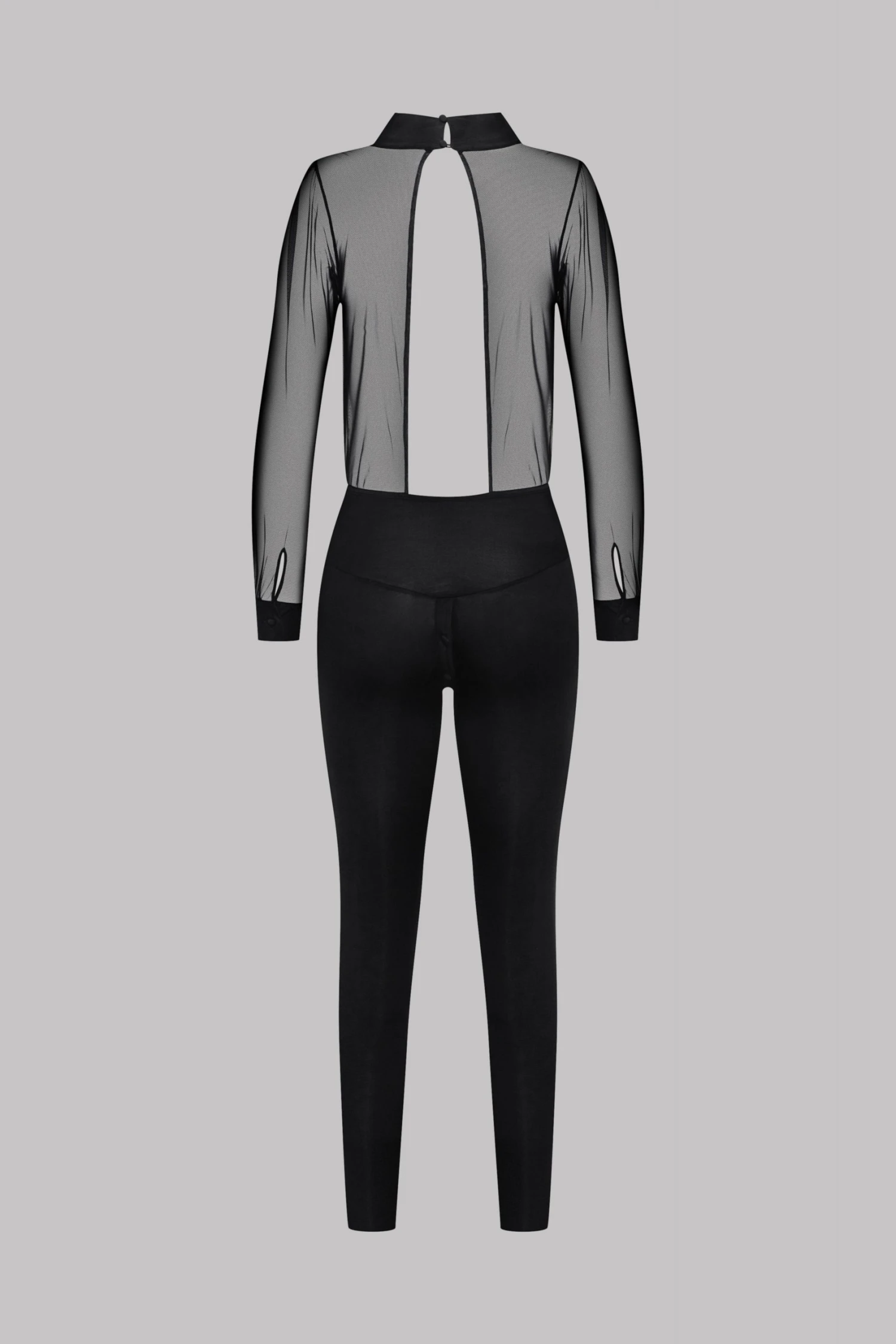 Long sleeves with slight gathers and buttoned cuffs in double-thickness mesh. Open sheer mesh back with neck buttons. Fitted opaque microfiber legs. Buttons between the legs.