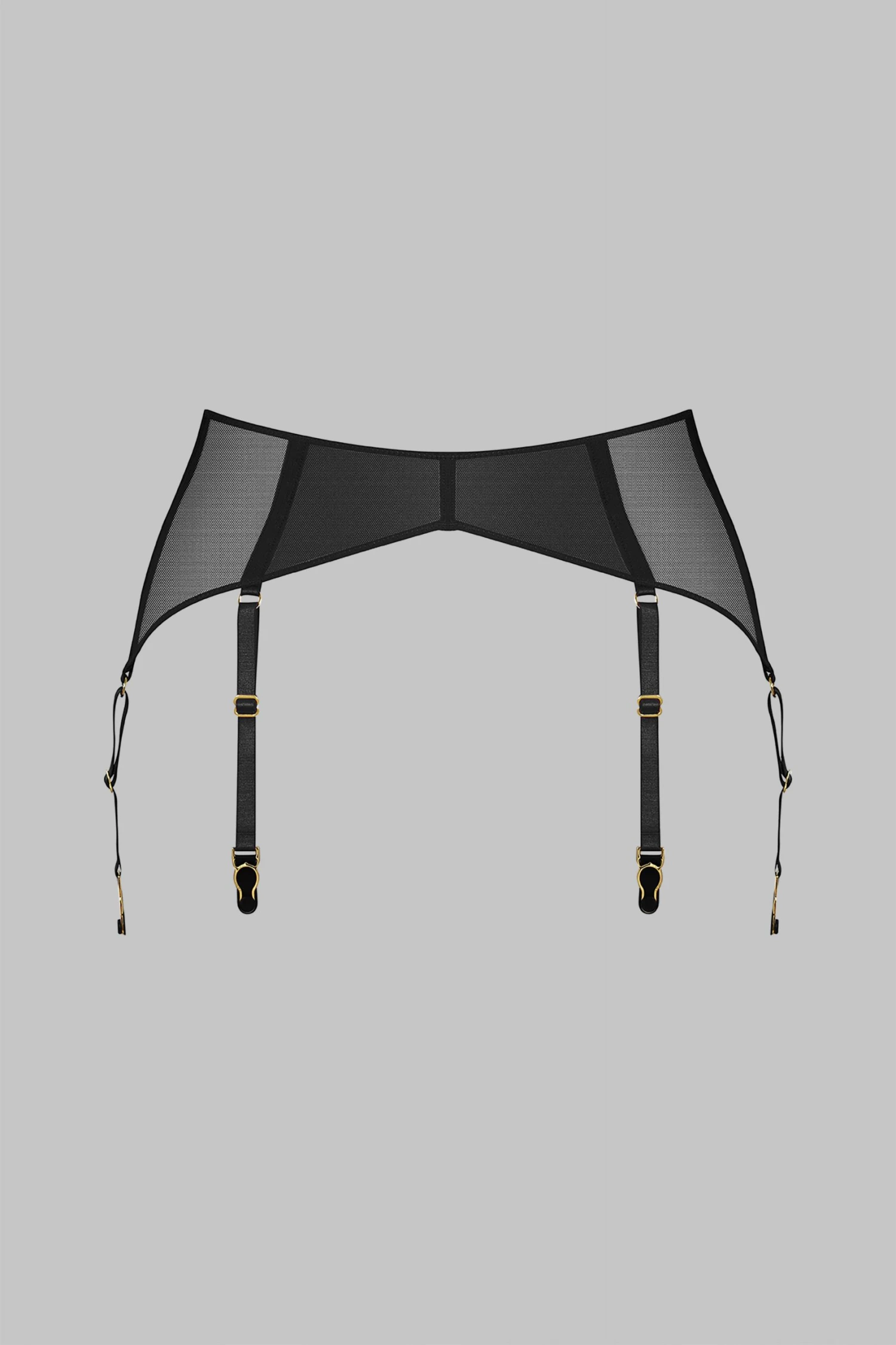 Garter belt in 100% sheer mesh. Arched front with lined mesh for a contrast of transparency and opacity. Six adjustable, non-removable garters outline the thighs. Sleek and subtle hook and loop back closure.