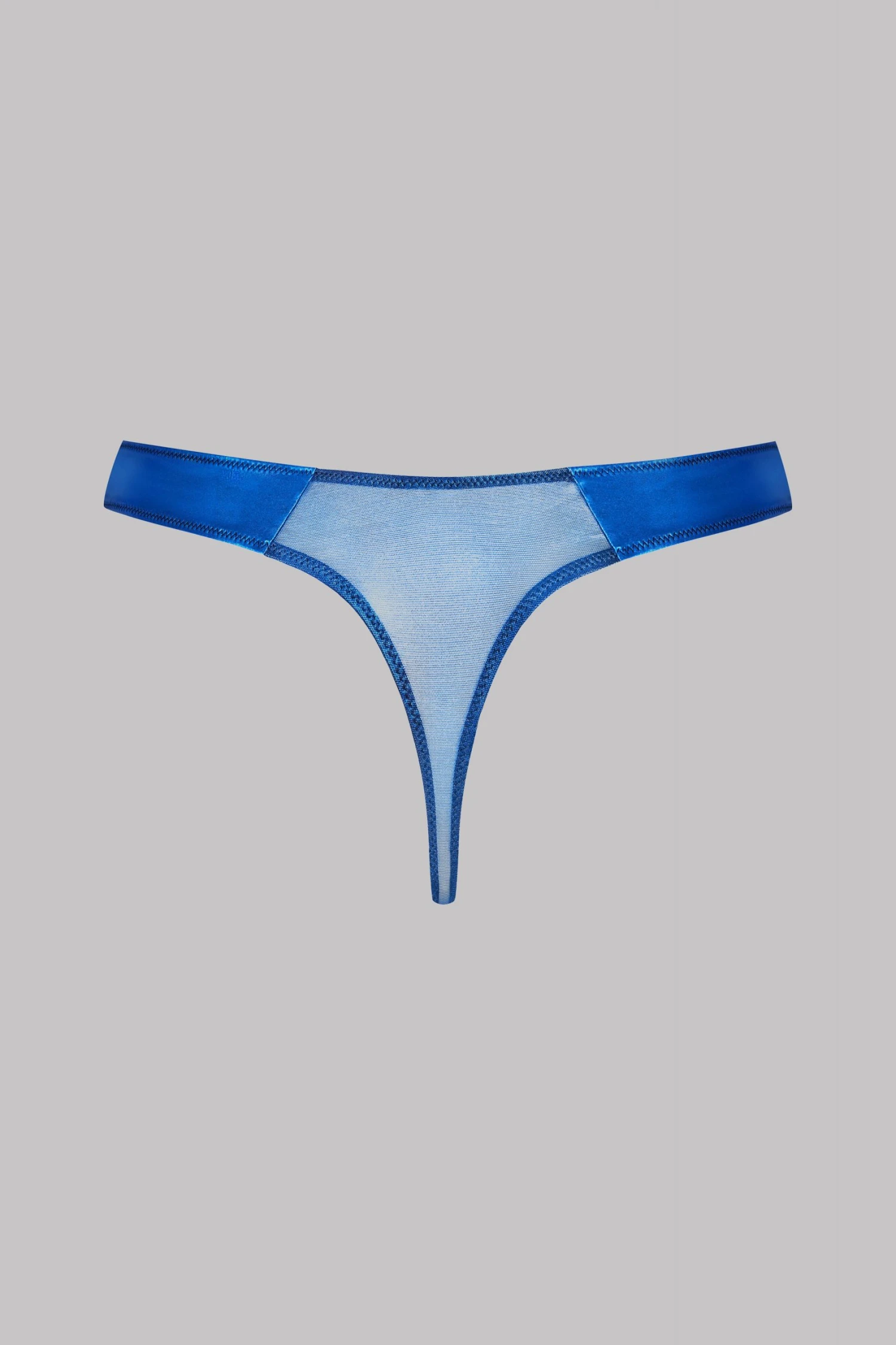 High hips thong in opaque microfiber and sheer tulle panel with metallic foil application.