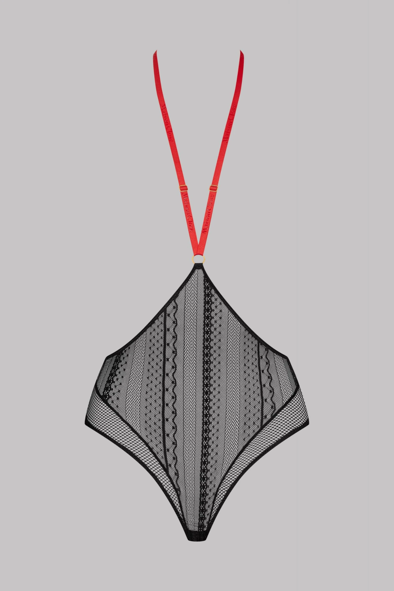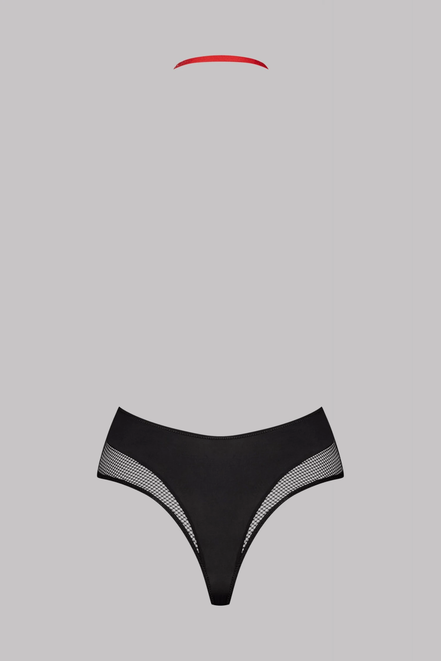 This sexy underwear is composed of a red harness that goes between the breasts and ends around the neck.