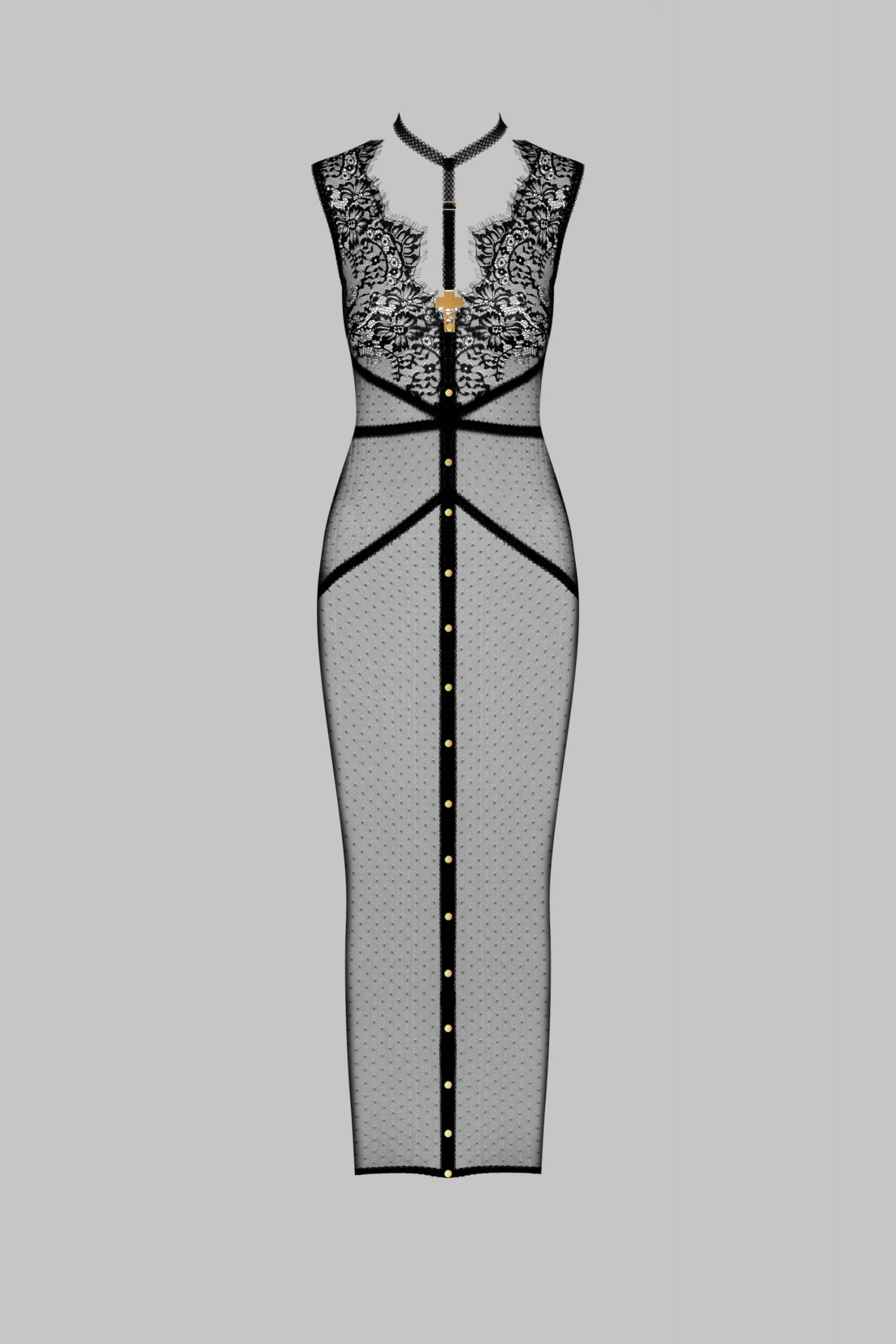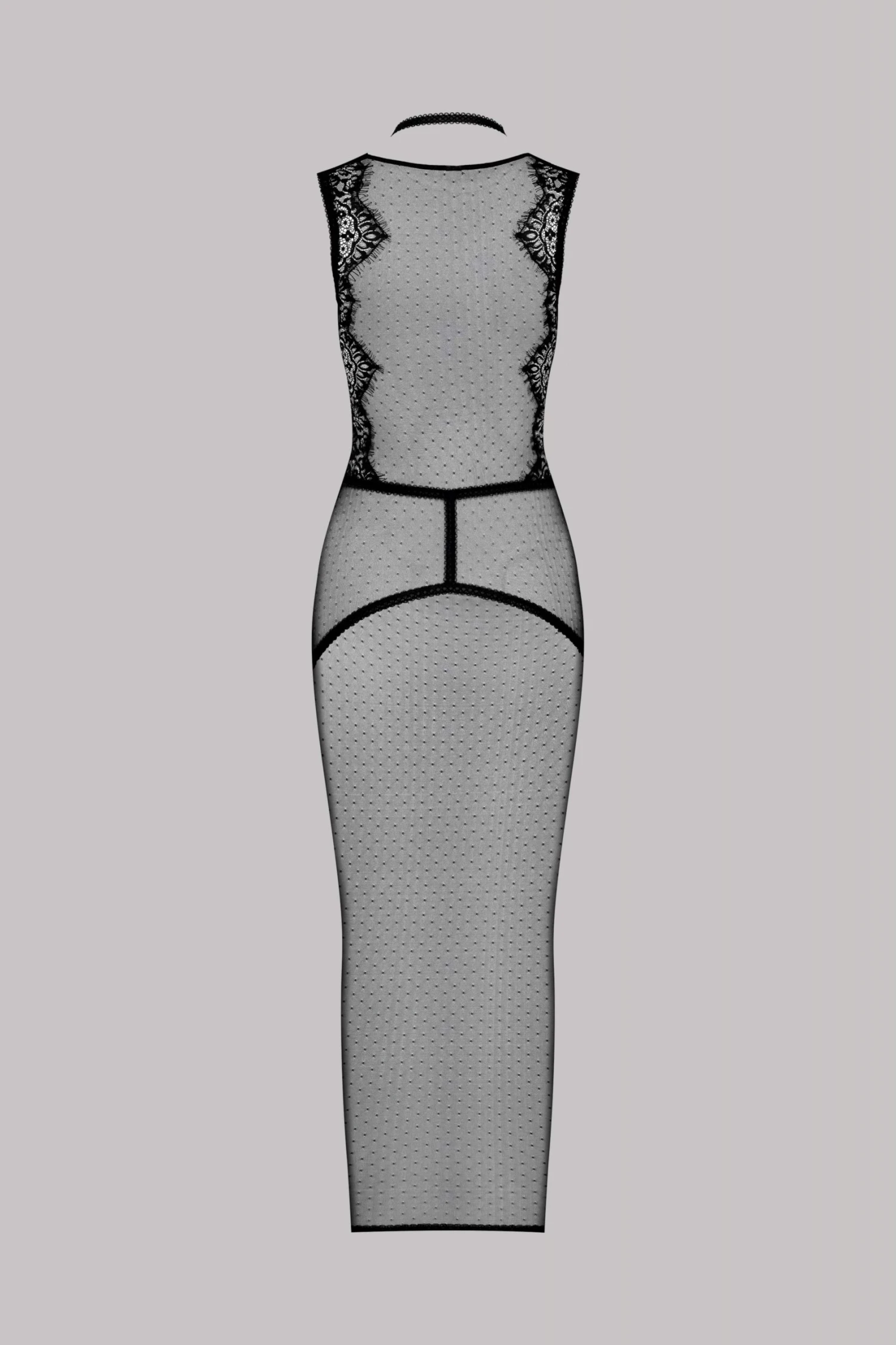 This long dress is made with a delicate mesh and is adorned with infinitely delicate lace.
