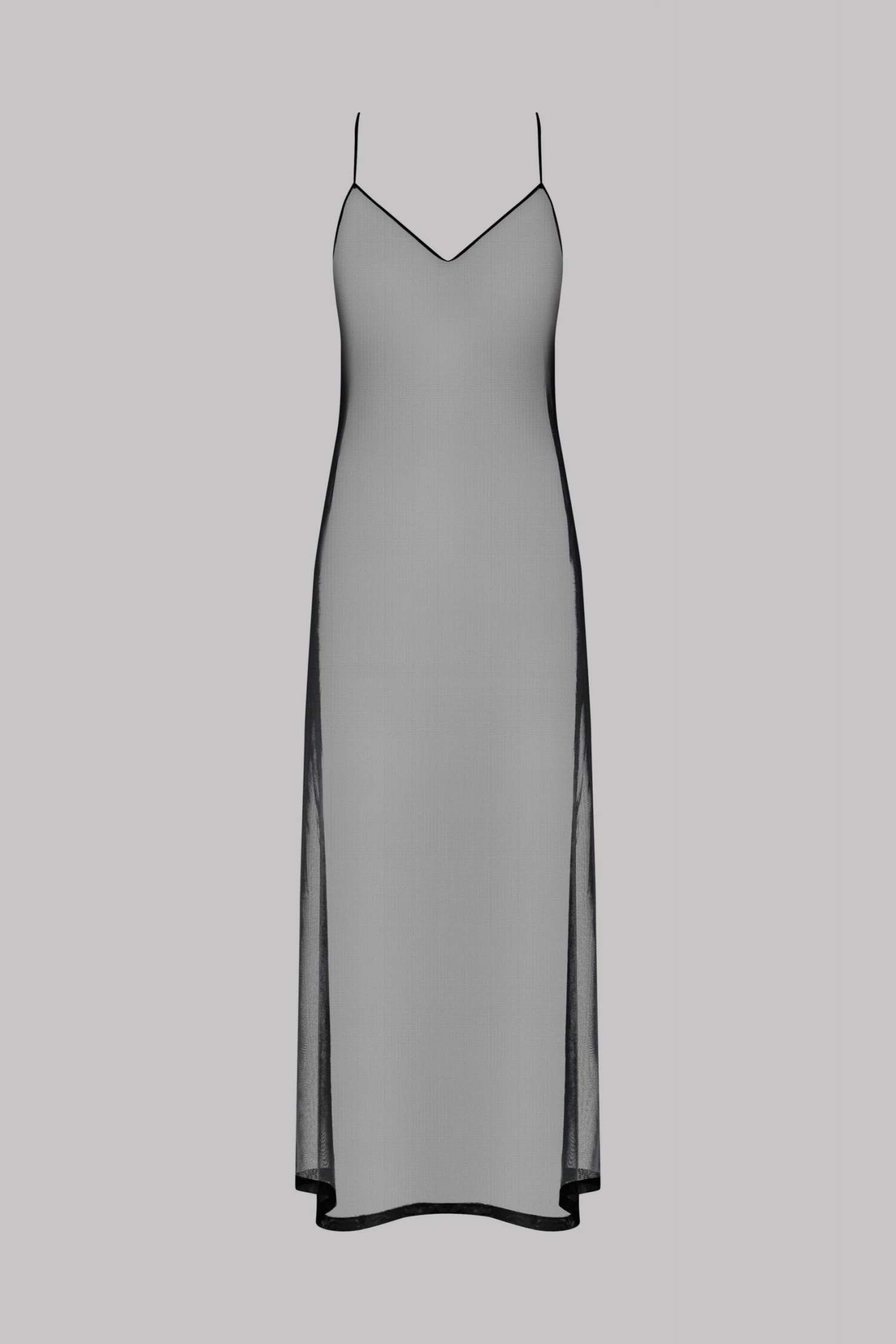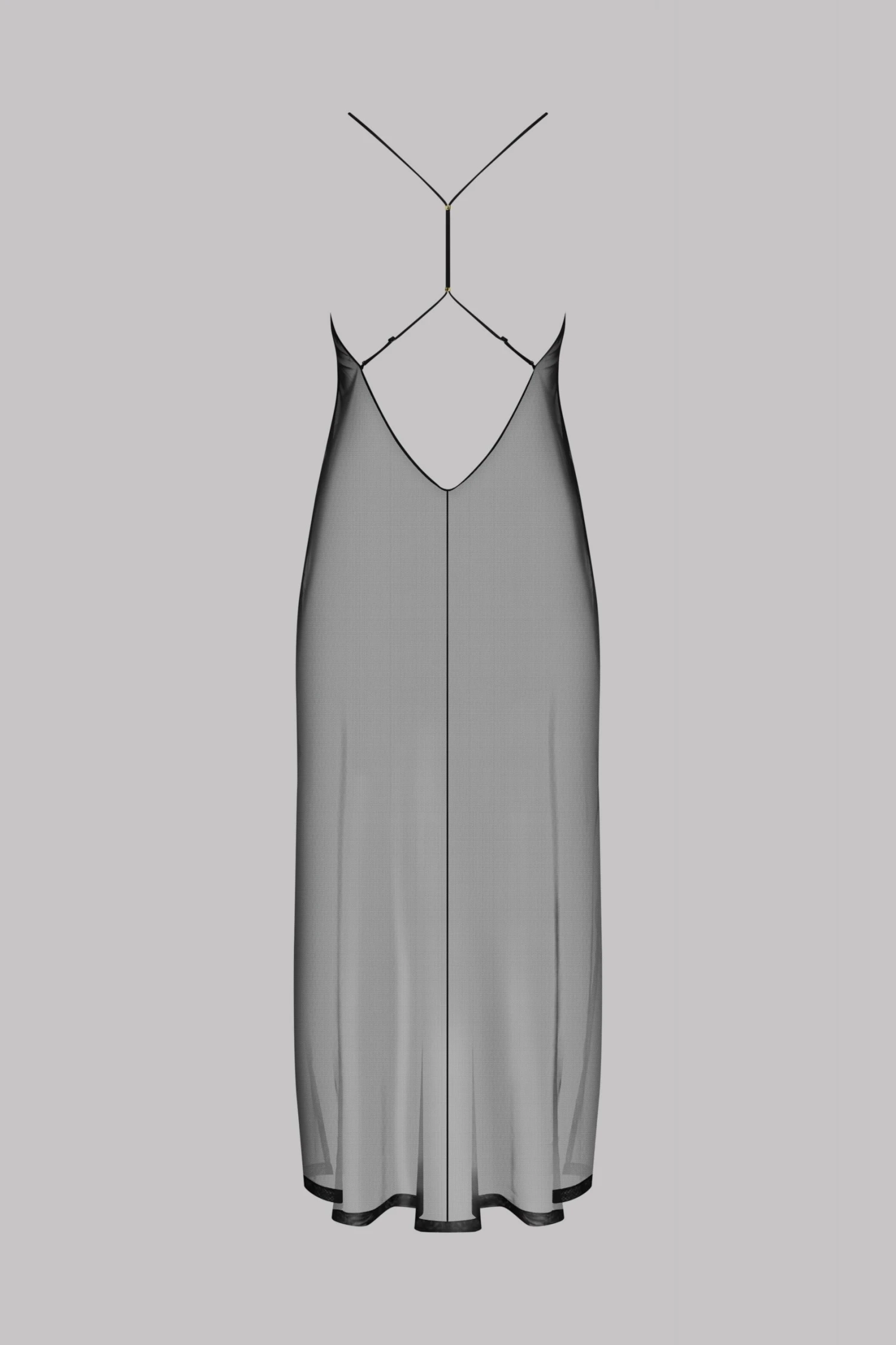 Long dress in sheer mesh. Low back. Floaty design. Narrow adjustable crossover straps with two golden beads. Side slits. Wear as is, over your Maison Close lingerie.