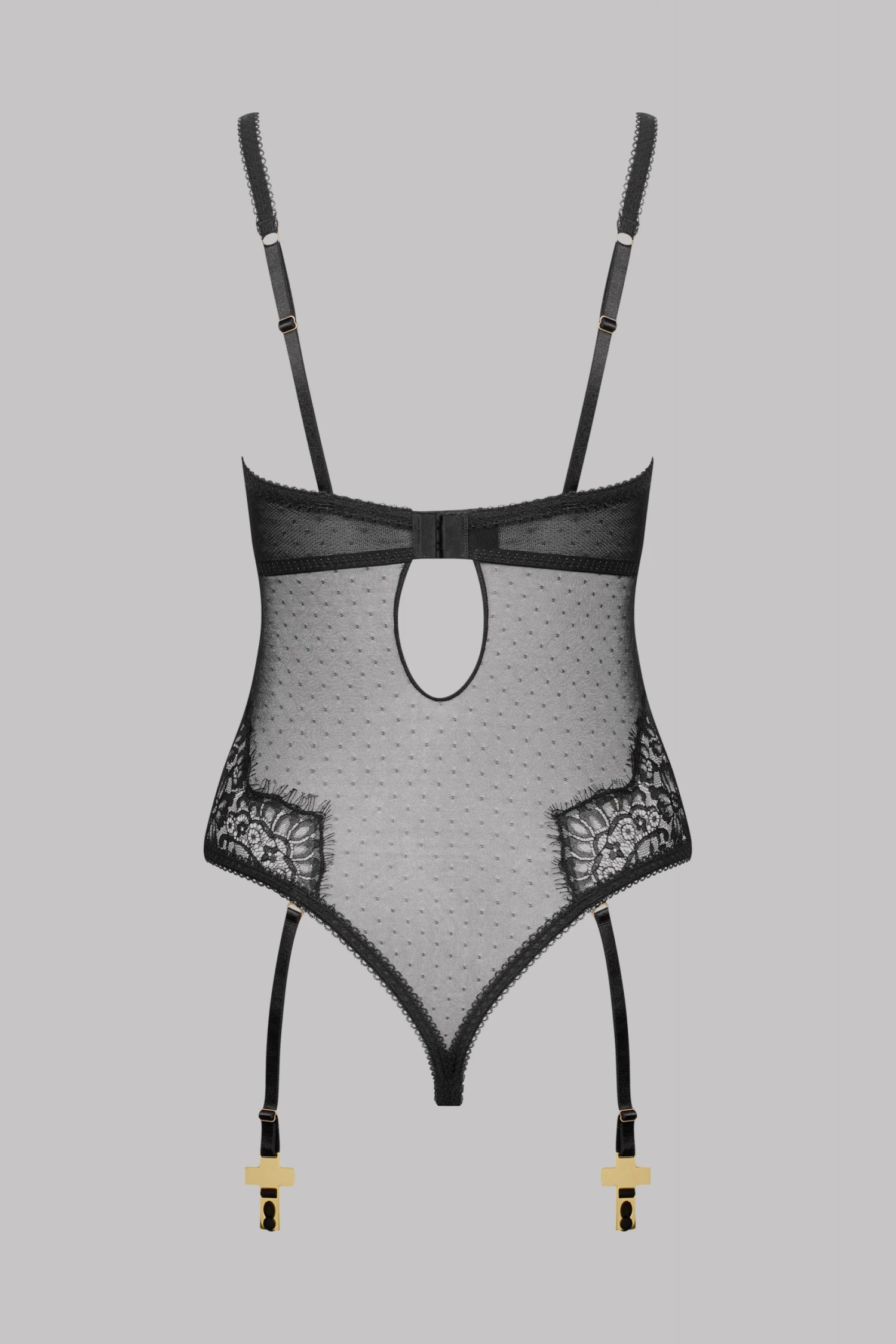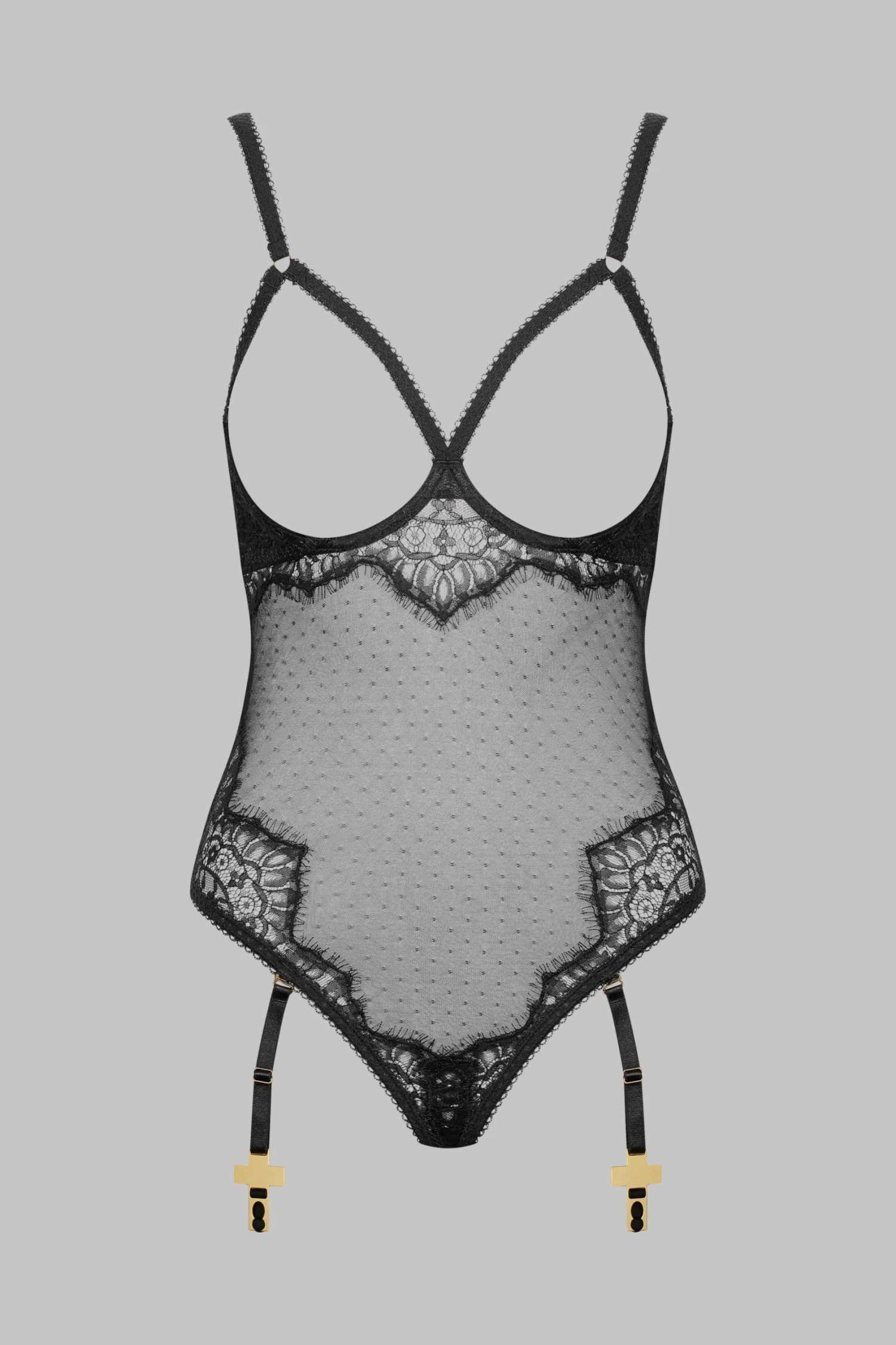 At the front, luxurious floral lace mingles with mesh to reveal with elegance the curves. At the back, the sexy bodysuit covers the back of elegance with mesh.
