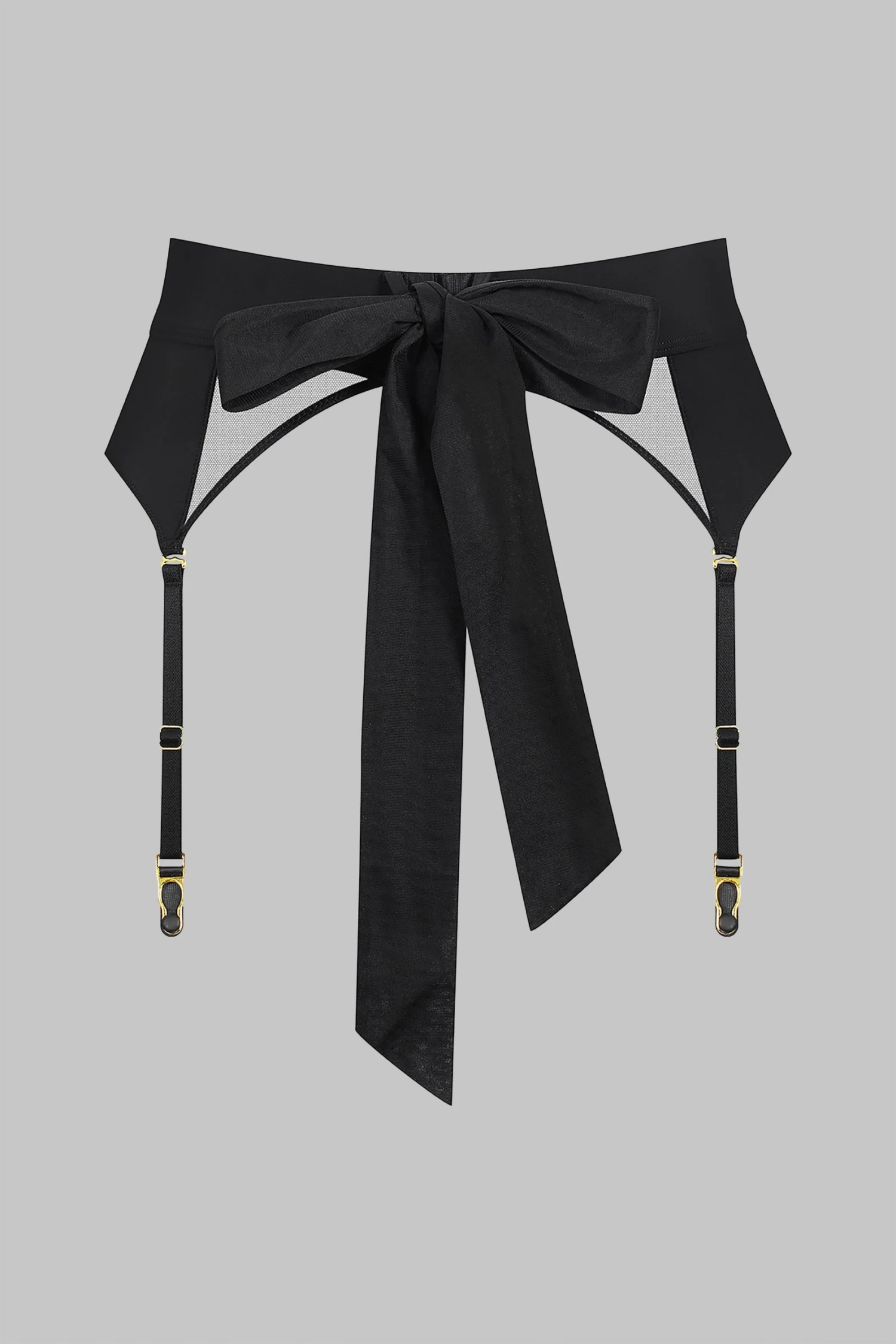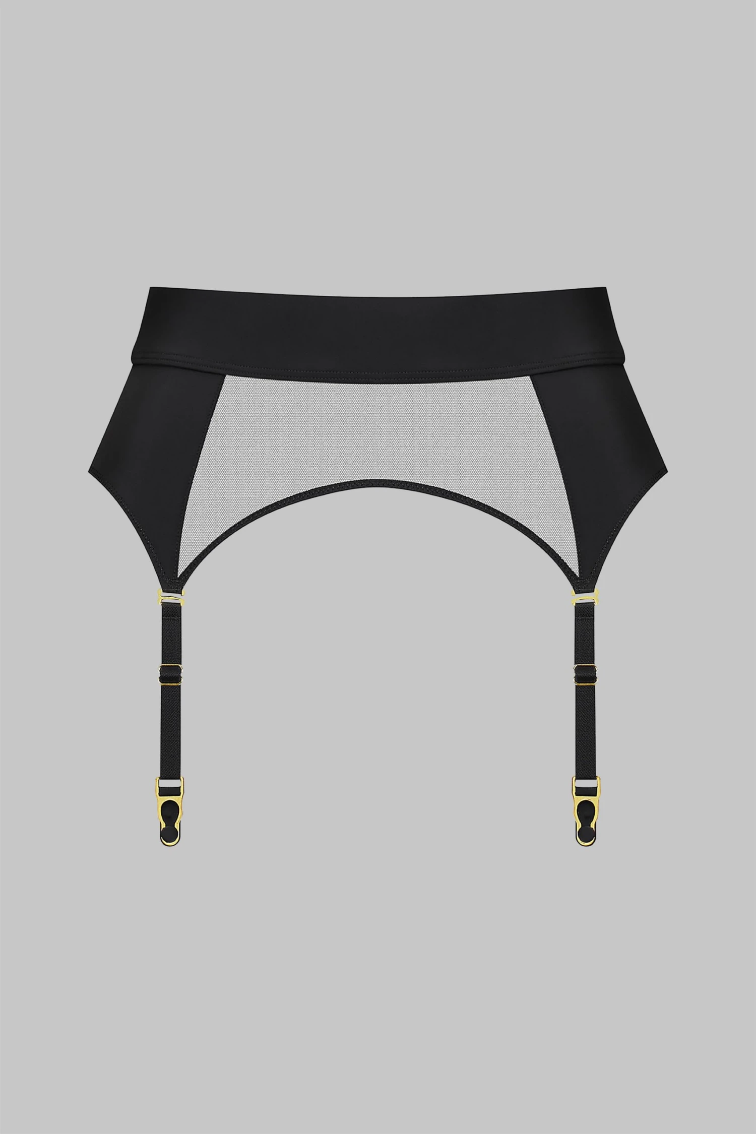 Suspenders belt in opaque microfiber and sheer mesh. Wide stretch belt with an adjustable fastening.