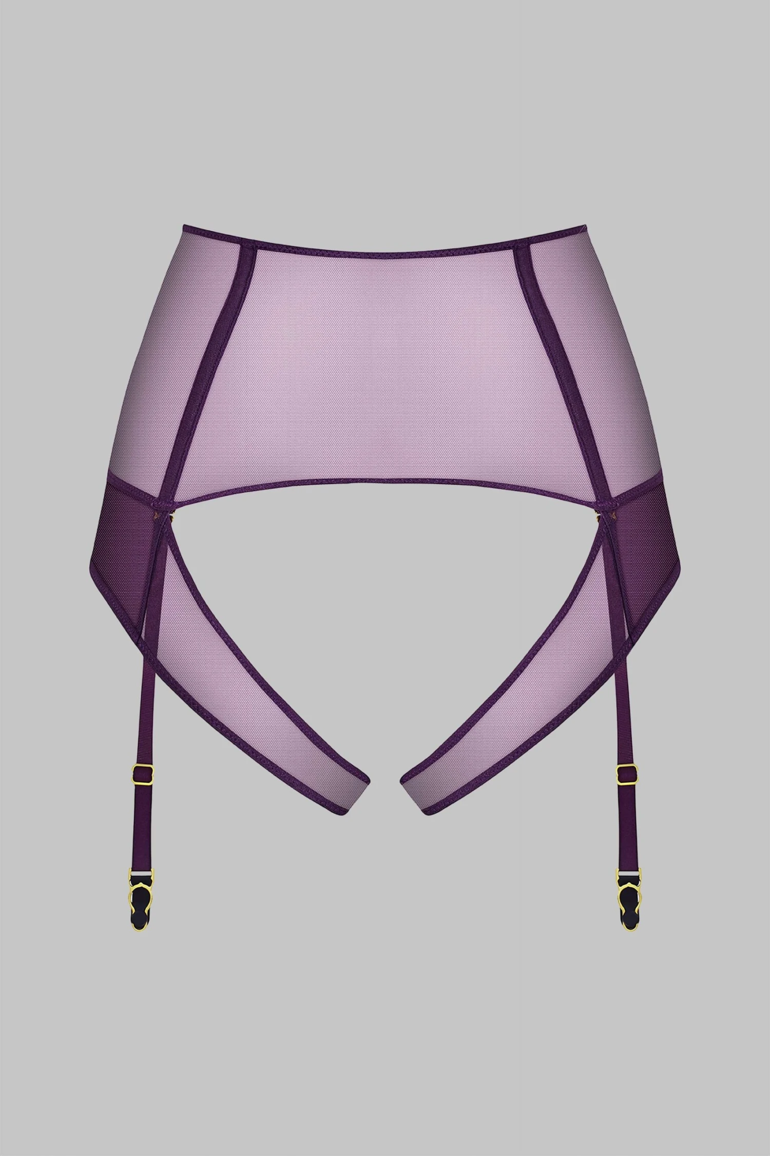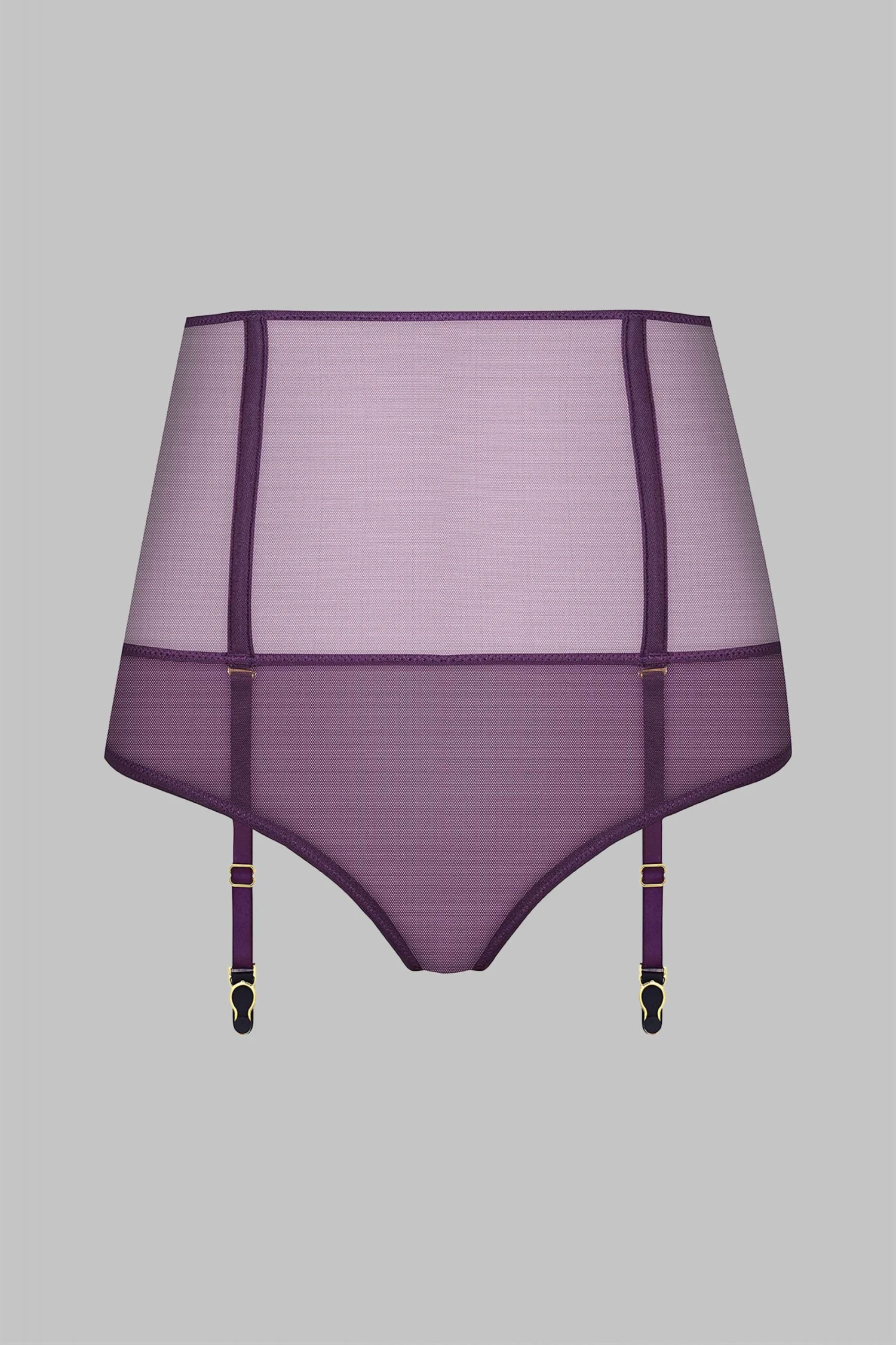 High-waist tanga in 100% sheer mesh. High-waisted belt structured by flexible boning. Two superimposed front panels open at the crotch to reveal beautiful heart-shaped buttocks. Removable and adjustable garters.