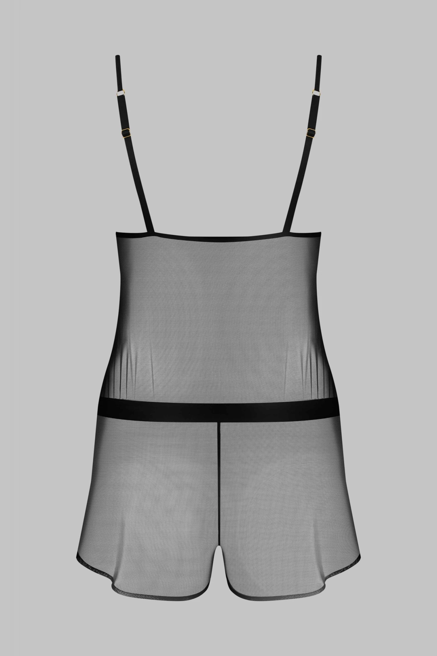 Teddy in sheer mesh with integrated microfiber tie belt. Narrow adjustable straps. Shorts have side slits.
