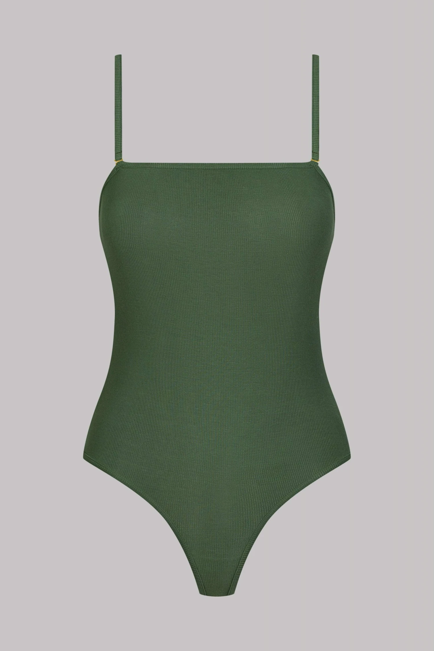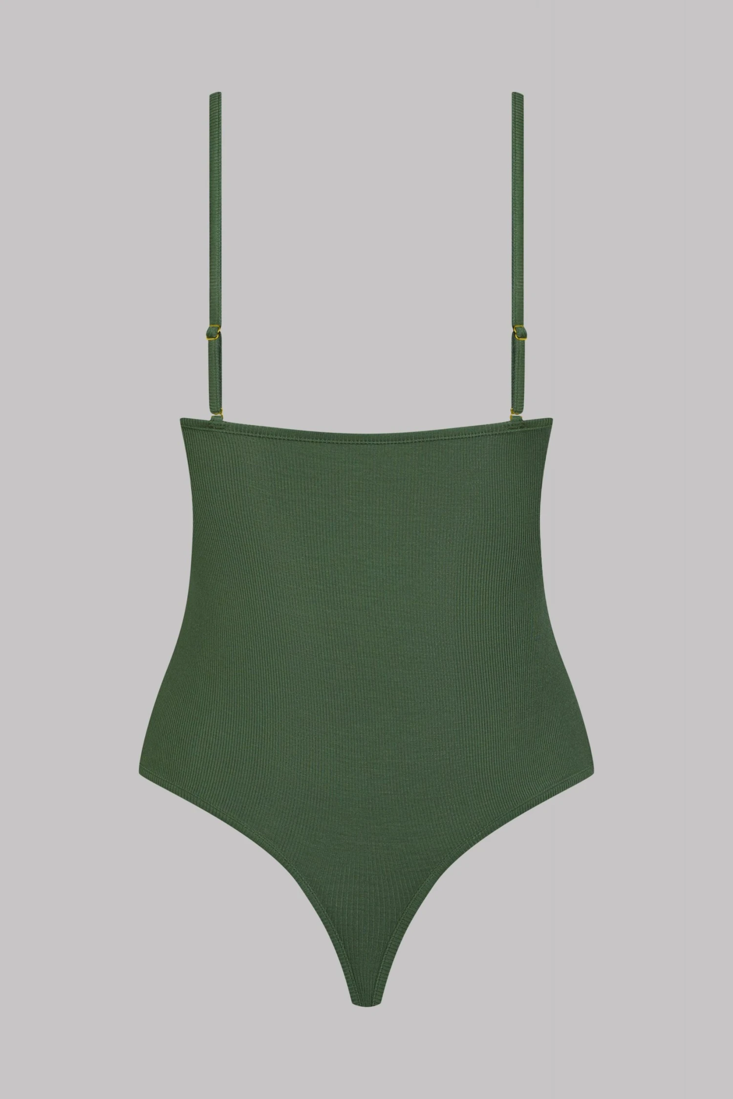 La Femme Amazone bodysuit with straps is a sleek one-piece with a high cut leg and a delicate fabric.
