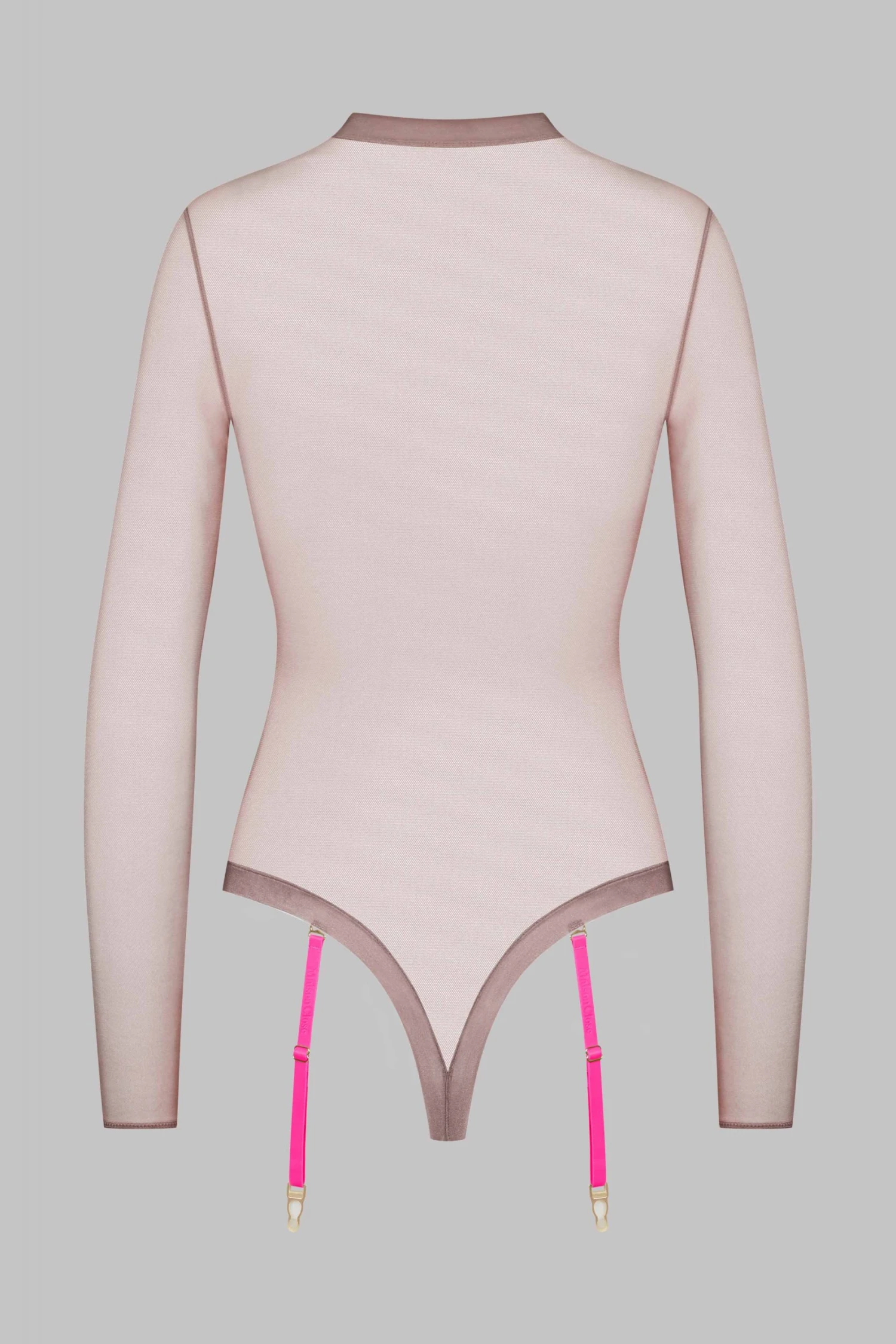 Transparent nude mesh body thong with a form-fitting cut and a gentle second skin effect. Long sleeves and collar complete the piece.